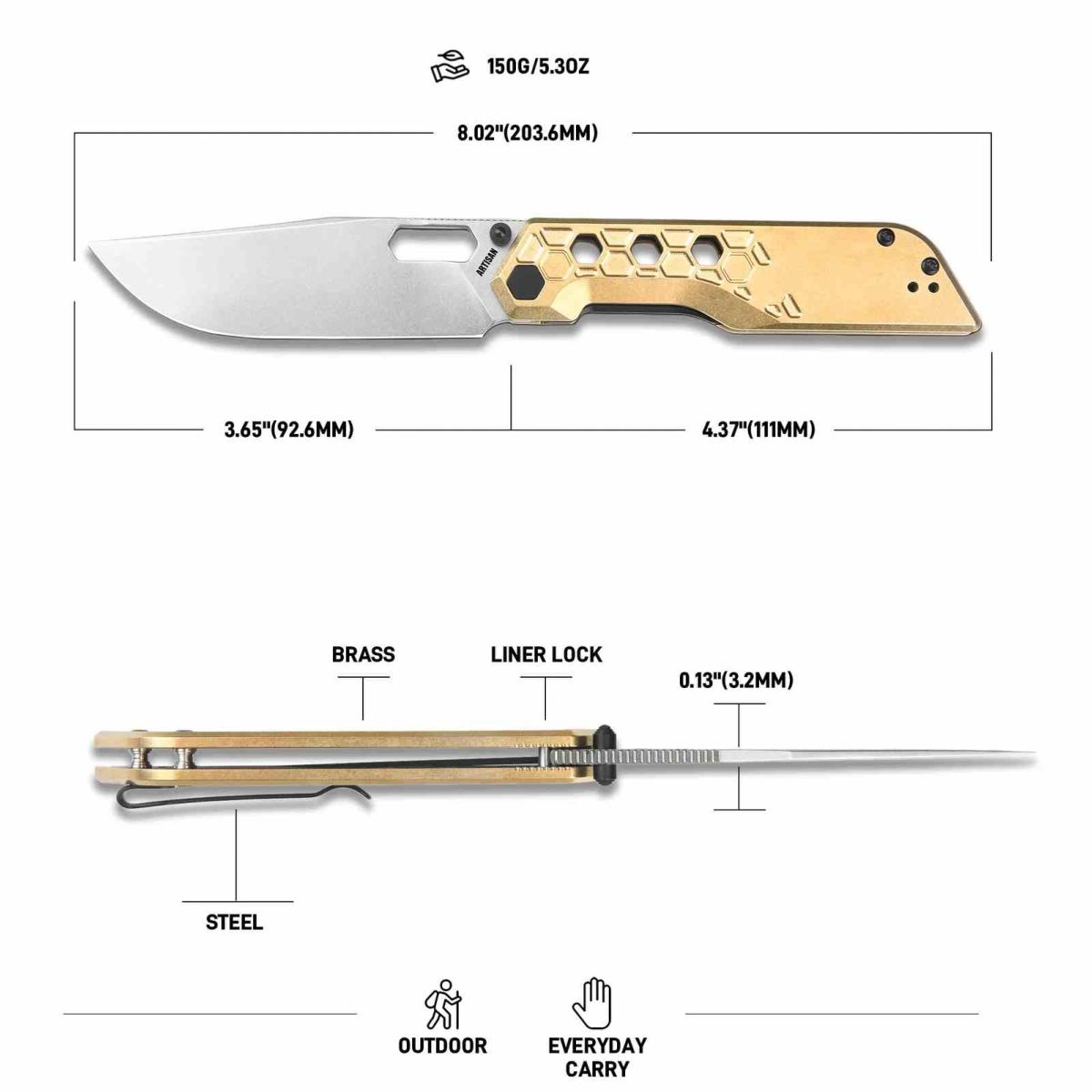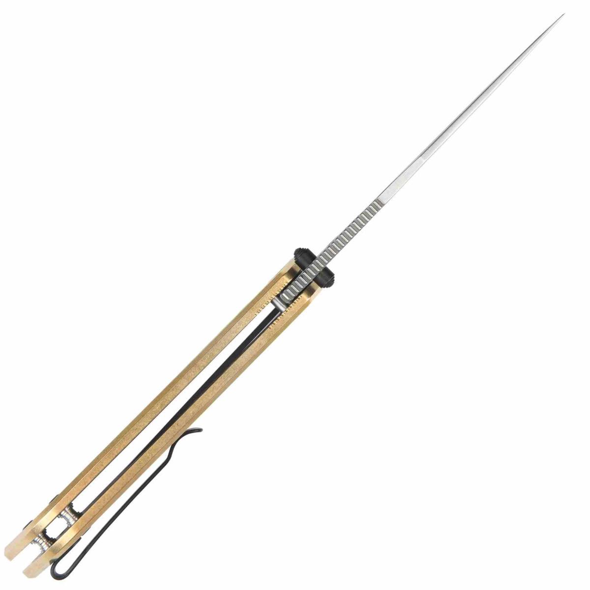 Le manche en laiton usiné (milled brass) apporte une esthétique vintage et une solidité remarquable, tout en donnant au couteau une présence unique. Le système d’ouverture front flipper monté sur roulements céramique assure une action fluide et rapide, tandis que le liner lock garantit une sécurité optimale.