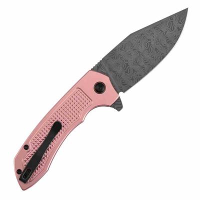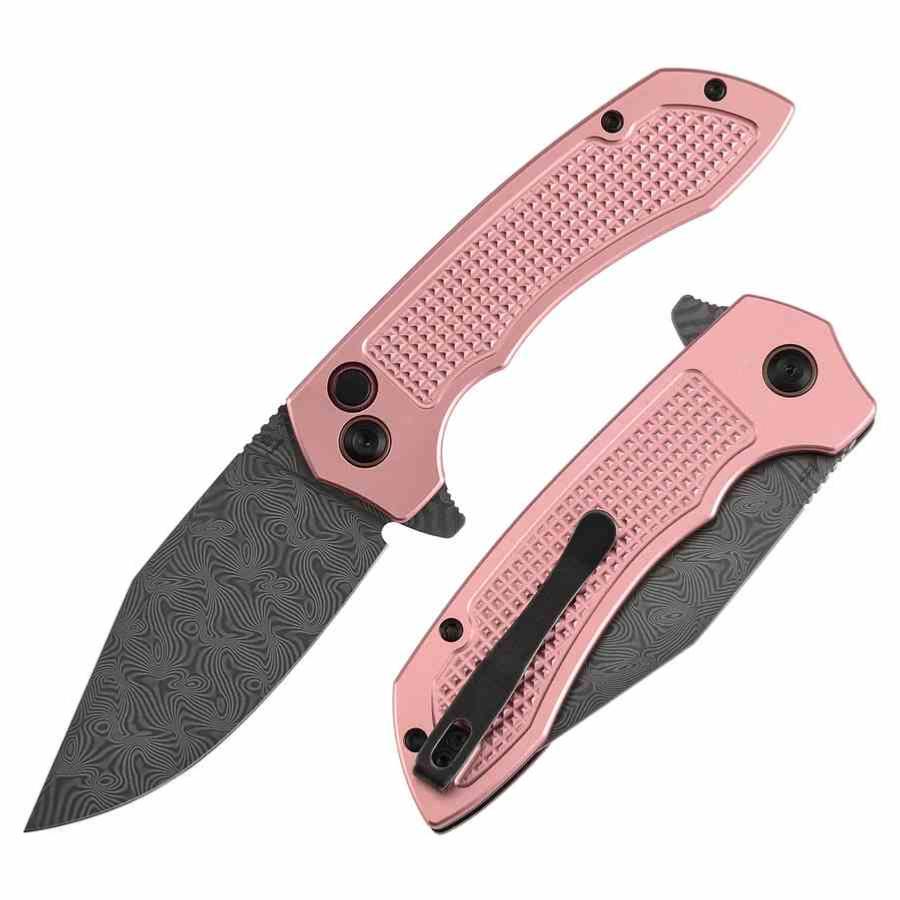 Le manche est usiné en Rose Gold Aluminum (Aluminium Or Rose) avec une texture quadrillée (Checkered Texture) offrant une prise en main raffinée mais extrêmement sûre. Le mécanisme de verrouillage Button Lock garantit un verrouillage solide et permet de refermer la lame d'une simple pression, faisant de ce couteau un outil aussi sécurisant qu'addictif à manipuler. Il est doté d'un clip de poche "Deep Carry" pour un port élégant et discret.