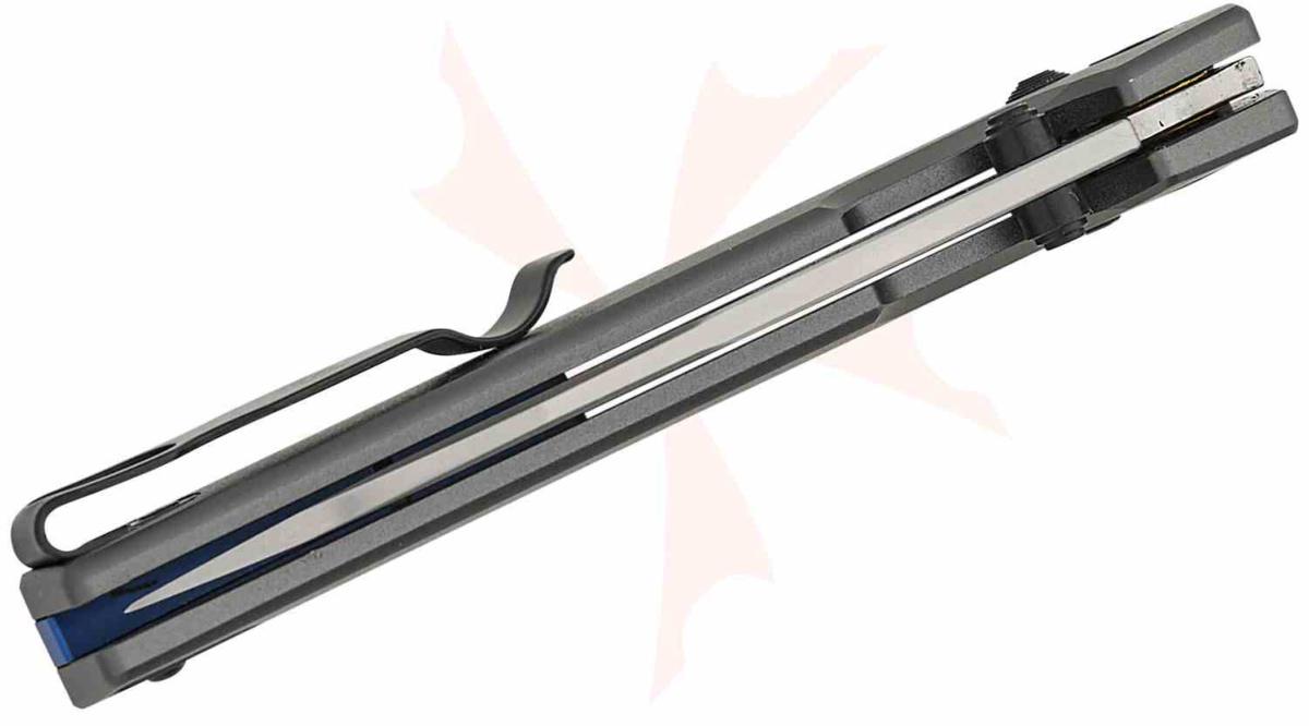 Le Manche en Aluminium Gris est à la fois robuste et léger, conçu pour supporter les rigueurs d'une utilisation quotidienne. Il est sublimé par des accents bleus (visserie et pivot), offrant un contraste visuel saisissant et un look technologique. L'ouverture est instantanée grâce au flipper monté sur un système de roulements à billes. Un clip de poche est inclus pour un port discret et sécurisé.