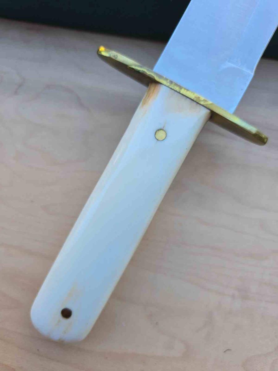 Le manche est composé de plaquettes en White Smooth Bone (os blanc lisse), offrant une prise en main naturelle, douce et élégante. La garde imposante en laiton protège efficacement la main tout en apportant une touche dorée classique au design. Ce Bowie est accompagné d'un étui en cuir brun de qualité supérieure, conçu pour un port à la ceinture sécurisé et une extraction rapide.