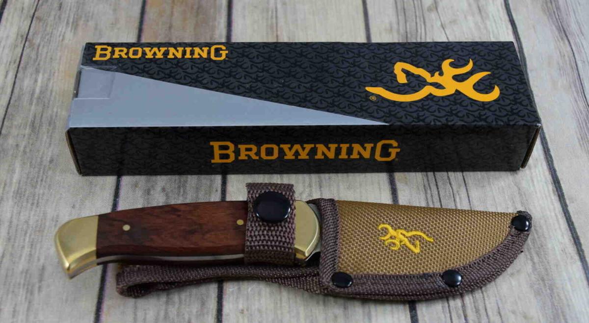 Descriptif : Le couteau skinner Browning est doté d'une lame drop point en acier inox avec une finition satinée. De conception plate semelle ce Browning possède des plaquettes en bois avec une garde & un pomeau en laiton. L'étui en nylon permet le port à la ceinture.