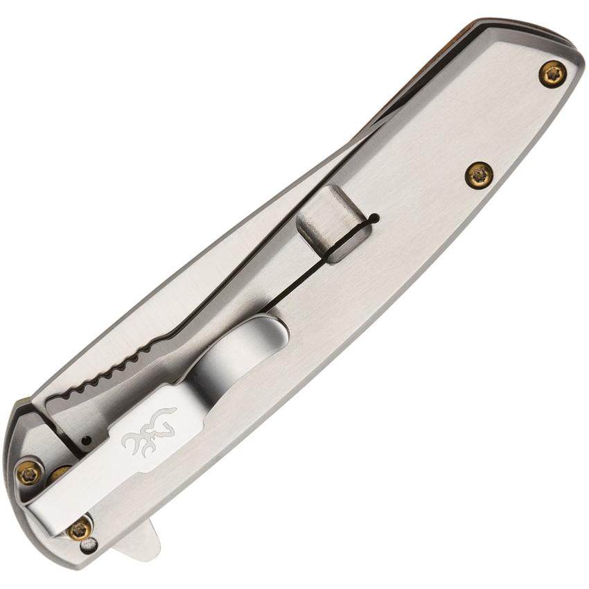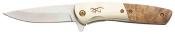 Descriptif : Le couteau Browning Nine Mile est doté d'une lame drop point en acier D2 59-61HRC avec une finition satinée. L'ouverture d'une main est très rapide grâce au ressort qui déploit la lame. Le manche est en acier & en bois avec une mitre en nickel. La sécurité framelock assure un blocage parfait de la lame et le clip un transport discret dans la poche & dans le sac.