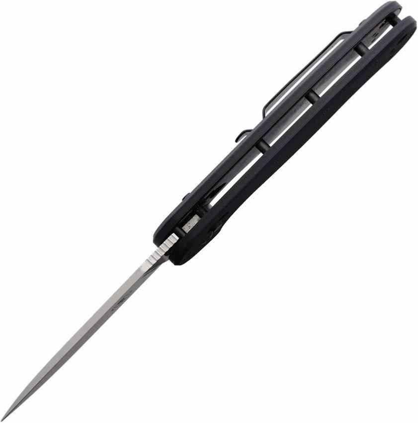 Le manche est en G10 noir, texturé pour une prise en main ferme, avec une ergonomie allongée et un profil plat. Le clip de poche est réversible tip-up / tip-down, pour un port adapté aux préférences de l’utilisateur.