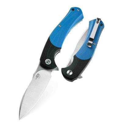 Description: Couteau EDC Bestech Penguin lame drop point en acier D2 59 61HRC -Pivot de la lame sur roulements à billes - Liners acier - Plaquettes dumanche black & blue en G10 - Ouverture d'une main - Sécuritélinerlock - Clip