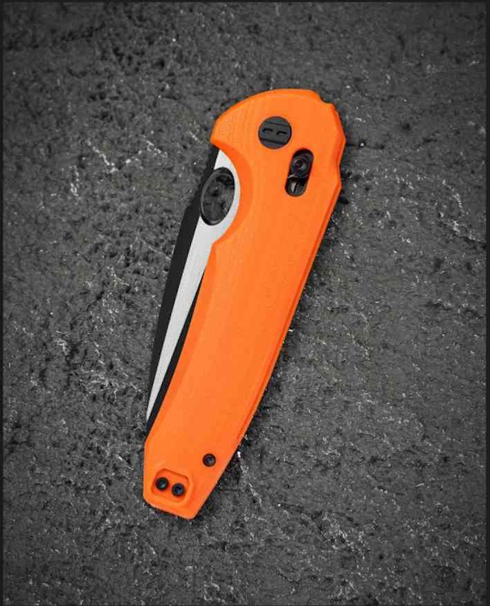 Ergonomie Tactique : Les plaquettes en G10 Orange offrent une texture assurant que le couteau ne glissera jamais.