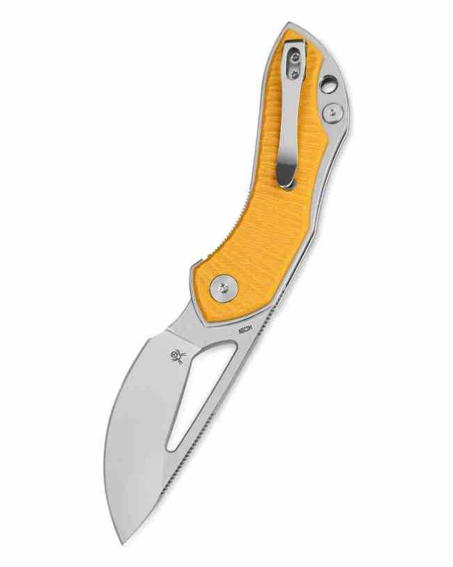 L’ouverture se fait via un thumb hole (trou de pouce) pour une manipulation simple et intuitive. Le liner lock assure une sécurité fiable en utilisation. Le manche en G10 jaune apporte une excellente adhérence et une visibilité maximale.