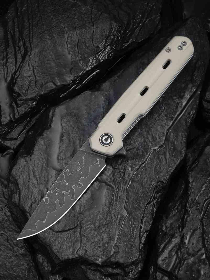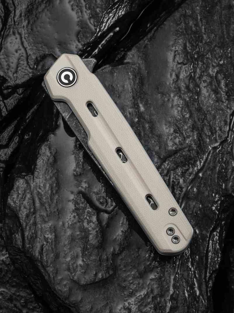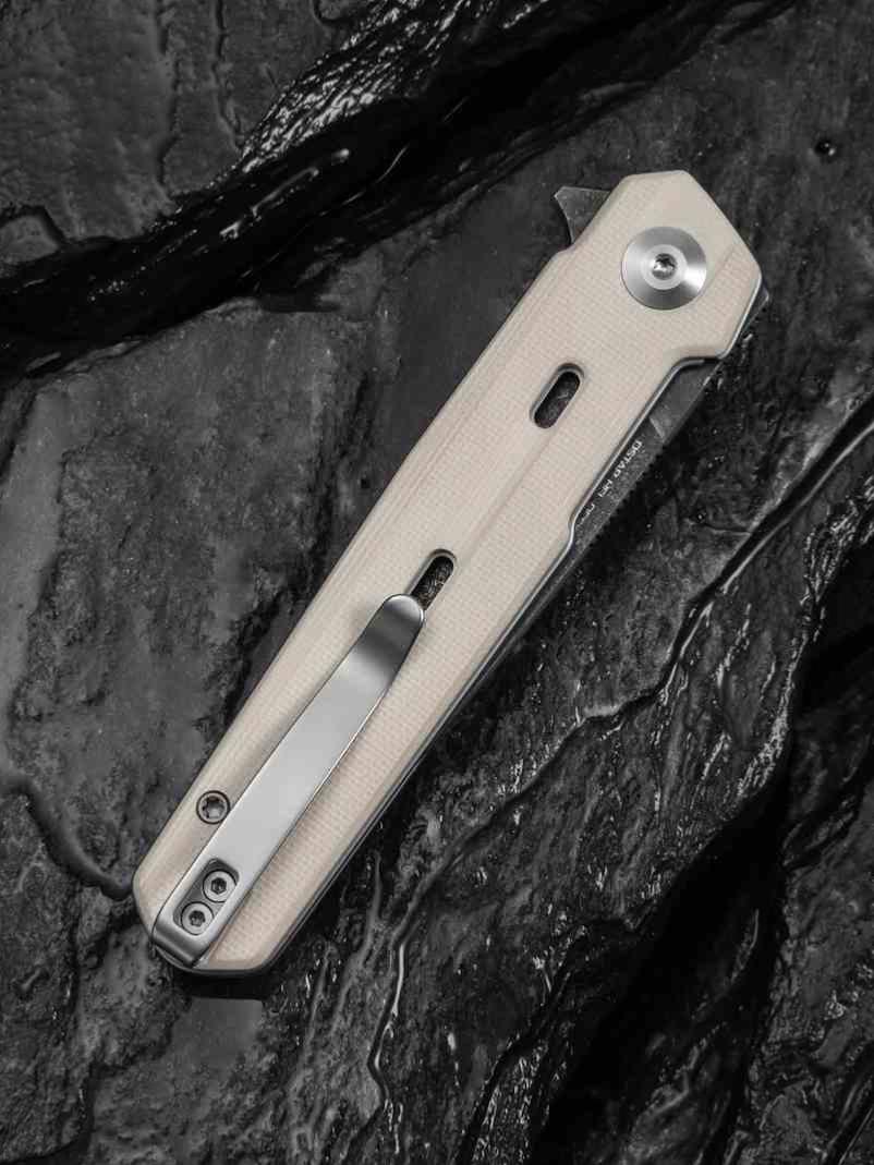 Le manche en G10 ivoire apporte une esthétique élégante et une excellente ergonomie. L’ouverture par flipper est rendue ultra‑fluide grâce aux roulements a billes ceramique, tandis que le liner lock assure un verrouillage fiable et securise.