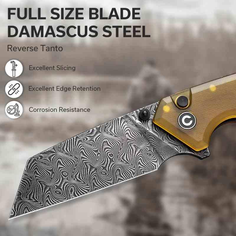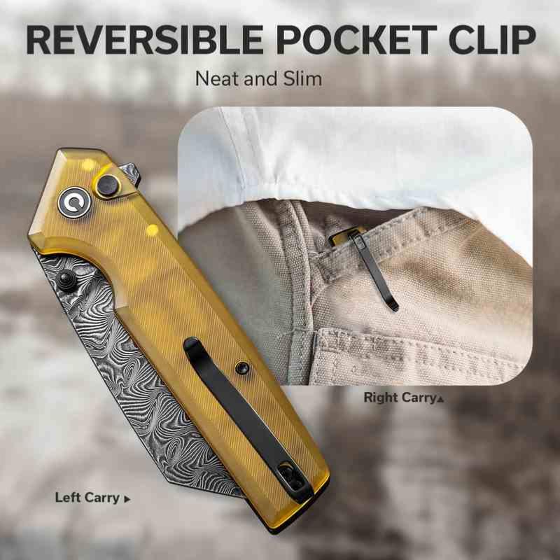 Le CIVIVI Amirite, conçu pour l’EDC moderne, associe une lame en acier damas au profil Wharncliffe modifié pour un tranchant précis et une pointe renforcée. Le système button lock assure une fermeture sécurisée et fluide, complété par un flipper et des thumb studs pour une ouverture ambidextre.