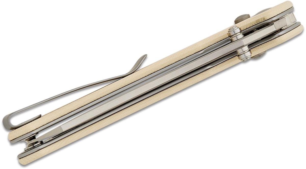 Le manche en G-10 ivoire est à la fois léger et résistant, offrant une prise en main confortable. L’ouverture de la lame se fait facilement grâce au pouce sur le bouton d'ouverture, tandis que le mécanisme de verrouillage crossbar permet une utilisation d'une main pratique et sécurisée. Le clip de poche réversible permet un transport facile et convient aux utilisateurs droitiers et gauchers.