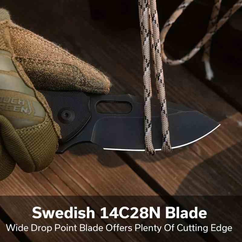 La lame au profil Drop Point est forgée en Lame Acier 14C28N, l'acier inoxydable de chez Sandvik, réputé pour son tranchant rasoir et sa facilité d'entretien. Elle bénéficie d'une finition Black Stonewash (noir délavé) qui protège l'acier tout en offrant un look tactique mat résistant aux rayures. L'ouverture est d'une fluidité exemplaire grâce au système de roulements à billes en céramique (Caged Ceramic Ball Bearing), activable instantanément via le flipper.
