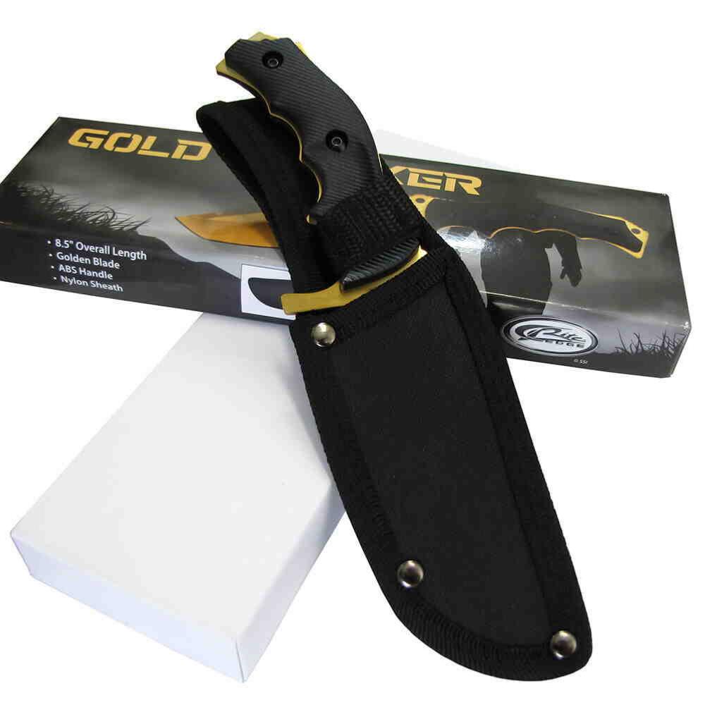 Descriptif : Le couteau de combat survie Tracker est doté d'une lame tanto avec une finition gold. De conception plate semelle ce tracker possède des plaquettes en abs avec un trou à l'extrémité pour le cordon de sécurité. L'étui nylon permet le port à la ceinture.