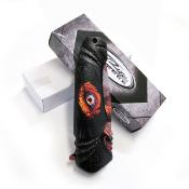 Descriptif : Le couteau Dragon Eye est doté d'une lame drop point en acier inox avec un décor dragon. L'ouverture d'une main est possible avec le pouce. Le manche est en ABS avec le décor d'un oeil. En position ouvert la lame du couteau est bloquée par un linerlock et le clip assure un accès rapide au couteau.