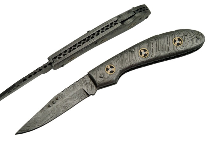Couteau Entièrement en Damas Lame & Manche pliant - Longueur fermé 10.16cm - Longueur de lame 7.62cm - Lame en acier Damas 128 couches - Manche en acier Damas avec Mosaic pins - Système de sécurité lockback