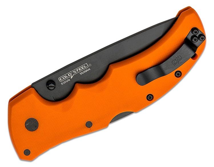 Descriptif : Le couteau Cold Steel Recon 1 tanto est doté d'une lame en acier S35VN 59-61HRC avec une finition noire. L'ouverture d'une main est possible avec le thumb. Le manche est en aluminium et en G10 Orange avec un trou en bout de manche pour le cordon de sécurité. En position ouverte la lame est sécurisée par un lockback puissant. Le clip permet un accès rapide au couteau.