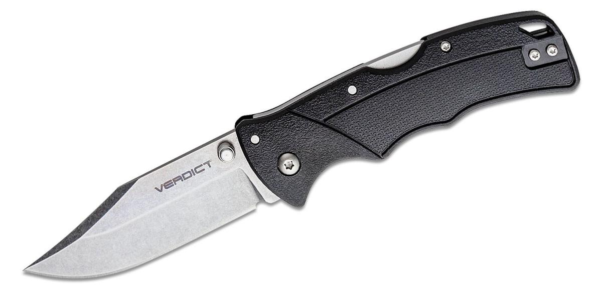 Descriptif : Le couteau EDC Cold Steel Verdict Black est doté d'une lame clip point en acier 4116 55-57HRC avec une finition délavée. L'ouverture d'une main est possible avec le thumb. Le manche est en fibre de verre avec un trou à l'extrémité pour le cordon de sécurité. La sécurité Tri-Ad lock assure un blocage parfait de la lame et le clip un accès rapide au couteau.