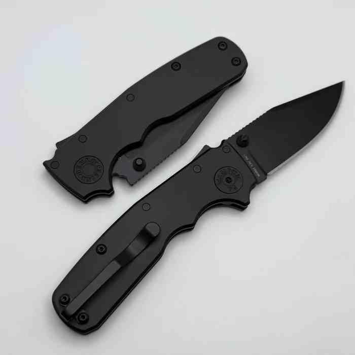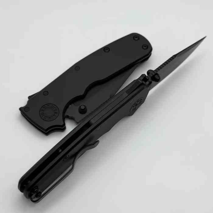 Le manche est en aluminium noir, léger et robuste, avec un thumb pull pour ouverture manuelle, un clip de poche et un tang étendu pour une manipulation sécurisée. Le couteau est livré dans un étui plastique rigide, prêt à l’emploi.
