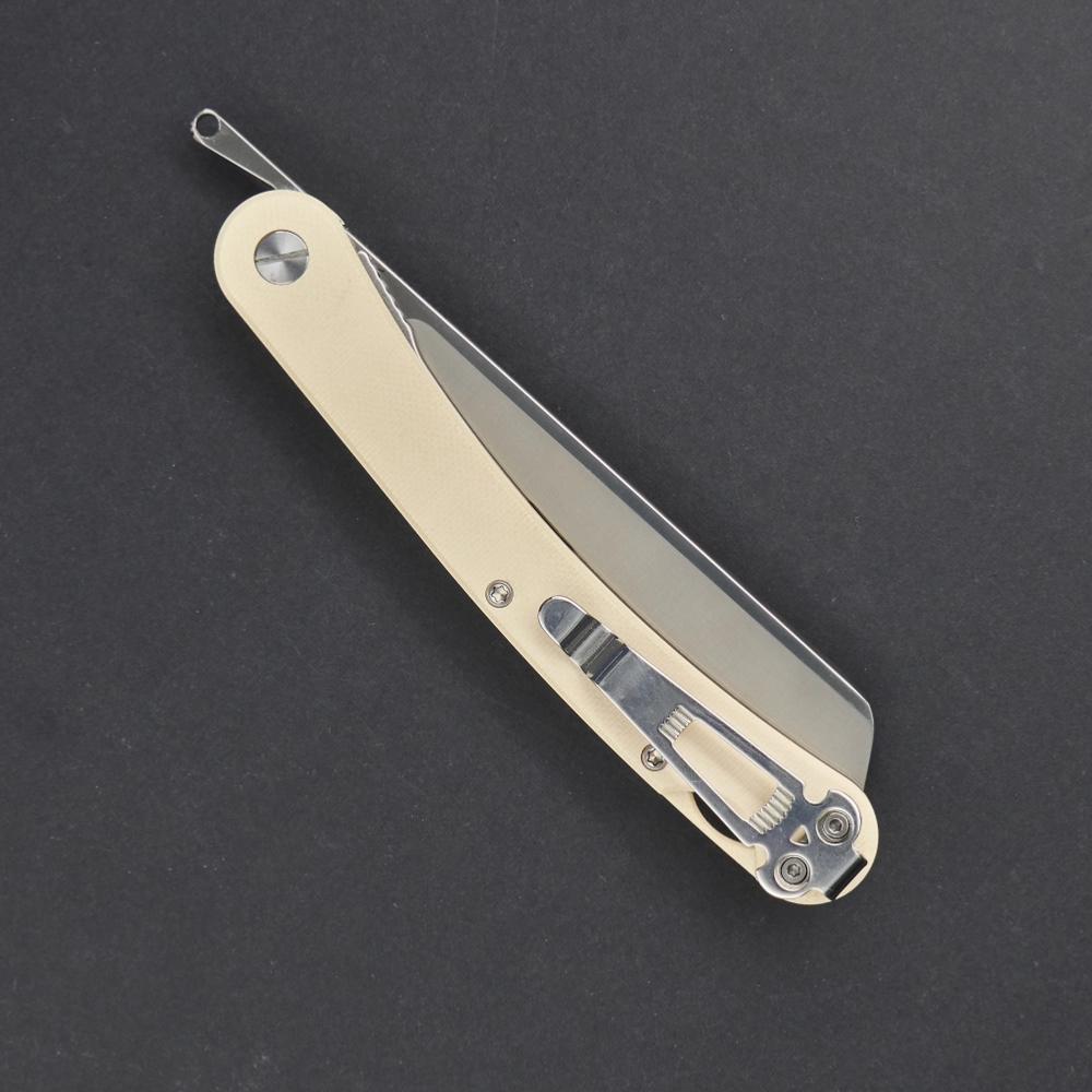 Découvrez le couteau Daggerr Boris Britva, un outil unique inspiré du style classique des rasoirs droits. Ce couteau pliant est équipé d'une lame sheepsfoot en acier VG10 avec une finition satinée. Le manche en G-10 blanc offre une prise en main légère et antidérapante. Le mécanisme de verrouillage liner lock assure une utilisation sécurisée et facile d'une seule main.