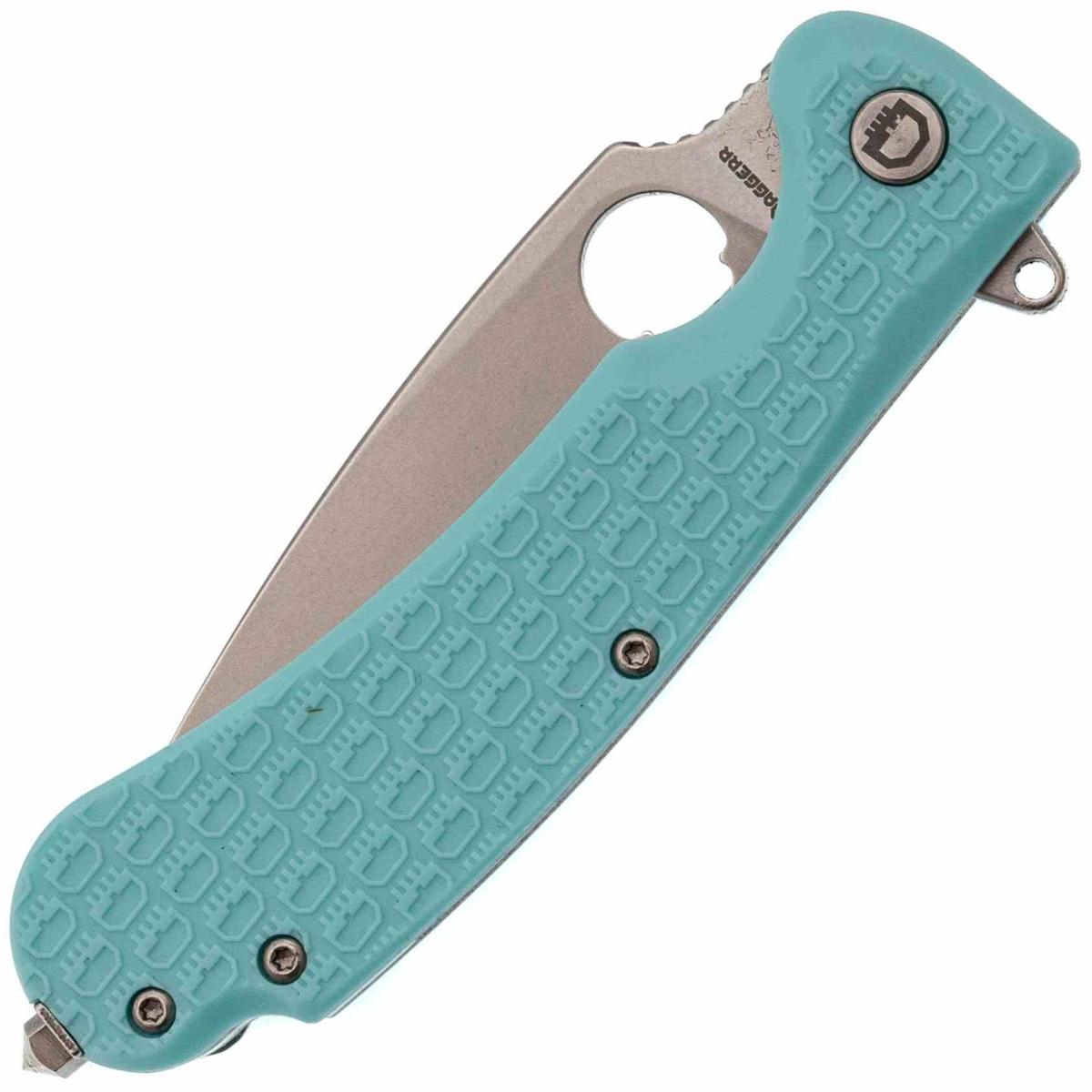 Le Resident DGRRSTFSW de Daggerr Knives est un couteau pliant EDC au design audacieux, combinant une lame spear point en acier 8Cr14MoV finition stonewash, avec un manche en FRN bleu clair texturé façon crâne stylisé. L’ouverture se fait via un flipper ou un thumb hole, et le verrouillage est assuré par un liner lock robuste. Le clip de poche screaming skull est équipé d’un brise-vitre, ajoutant une touche fonctionnelle et décalée.
