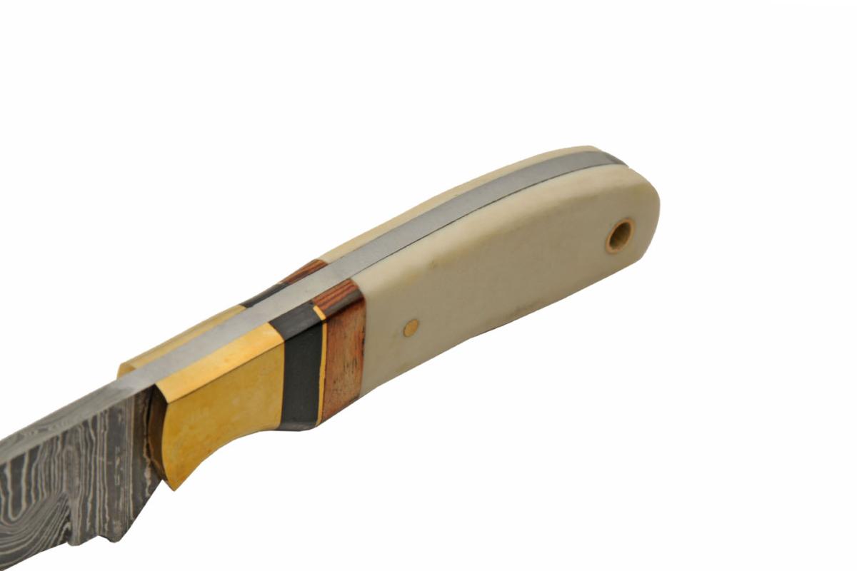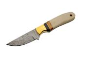 Descriptif : Le couteau Skinner Damas Autumn Hunter Bone est doté d'une lame drop point en acier damas 256 couches. De conception plate semelle le skinner possède un manche en os avec des mitres en laiton & bois avec un trou en bout de manche. L'étui cuir permet port à la ceinture.