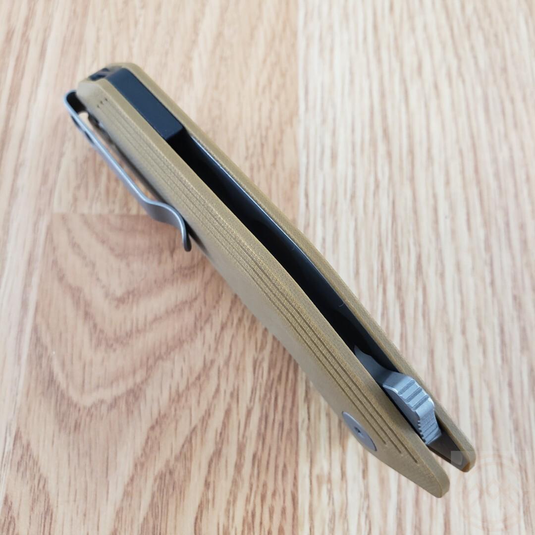 Manche : Manche en G-10 tan, léger et résistant, avec une prise en main ergonomique.