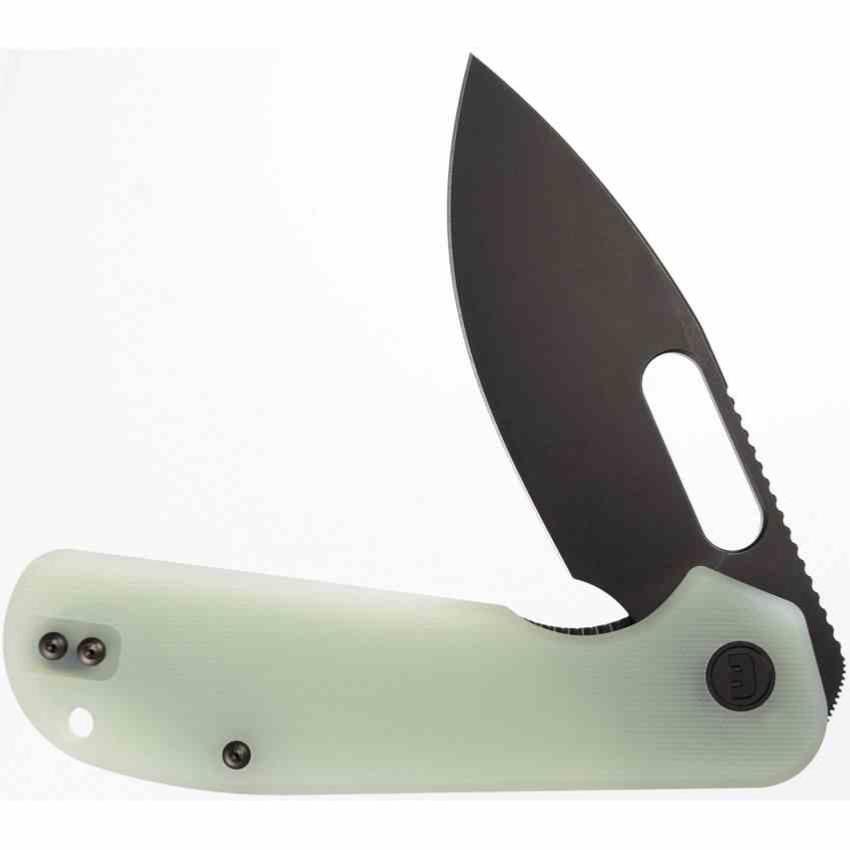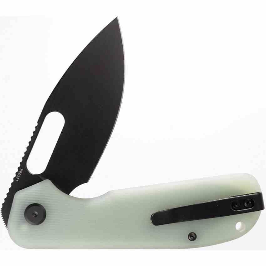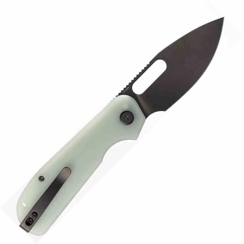 Le manche est en G10 jade texturé, assurant une bonne prise en main et une esthétique translucide originale. Le clip de poche est positionné tip-up, et un trou pour dragonne est intégré. Le design est signé Yue Dong, pour une ergonomie fluide et un style affirmé.