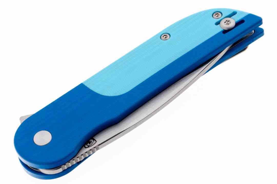 Le manche G10 Blue/Light Blue, combinant bleu profond et bleu clair, apporte une esthétique vive et une excellente adhérence. Le couteau reste très fin en poche grâce à son liner lock acier et son clip fil réversible, parfait pour un port discret. L’ouverture par flipper tab est fluide, précise et agréable, avec un ajustage soigné typique de Finch.