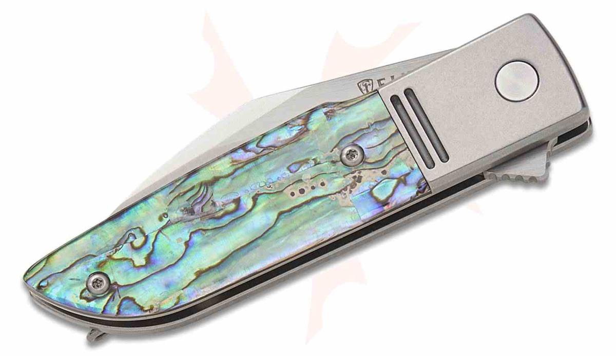Le manche en acier inox est sublimé par une échelle en véritable Abalone, apportant des reflets naturels uniques. Le frame lock acier assure une sécurité solide, tandis que le clip fil garantit une portabilité discrète. L’action du flipper est fluide et précise, avec un ajustage soigné.