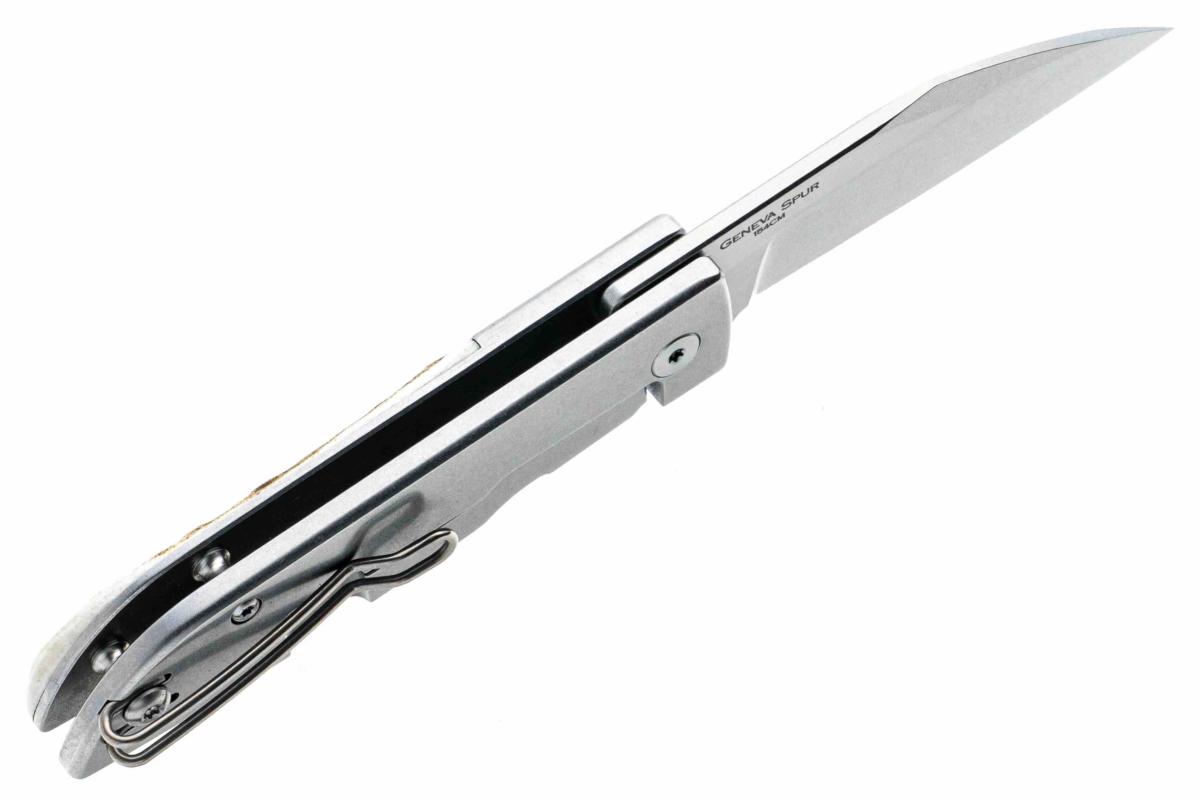 Le Finch Geneva Spur Stag Horn est un flipper compact et élégant, pensé pour l’EDC premium. Sa lame Wharncliffe en acier 154CM de 7,4 cm reçoit une finition two‑tone mêlant stonewash et brossé. L’acier 154CM offre un excellent compromis entre tranchant, tenue de coupe et résistance à l’usure, avec une dureté d’environ HRC 59‑61.