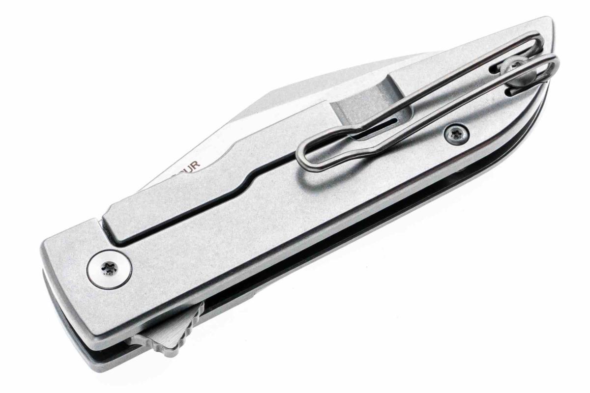 Le manche en acier inox est sublimé par une échelle en véritable Stag Horn, chaque pièce étant unique. Le frame lock acier assure une sécurité fiable, tandis que le clip fil garantit une portabilité discrète. L’action du flipper est fluide et précise, grâce à une fabrication soignée.