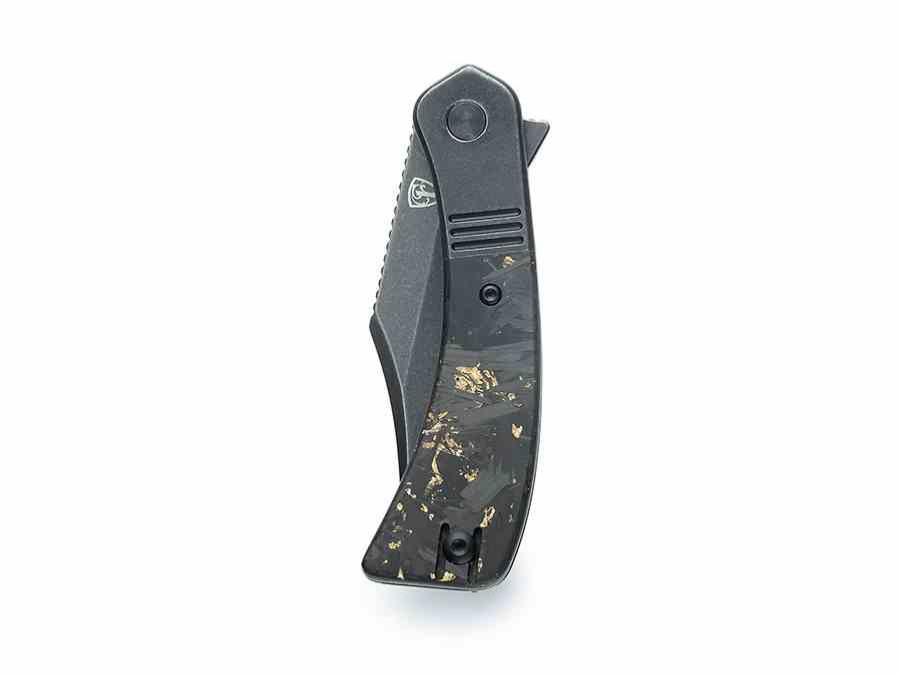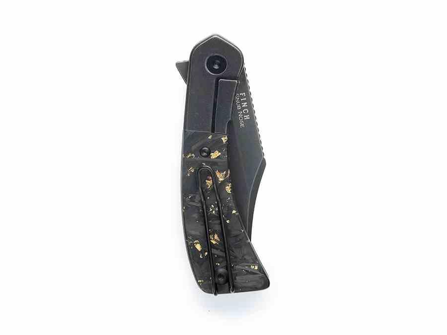 Le manche est une véritable vitrine technologique, composé de plaquettes en Carbon Fiber (Fibre de Carbone) avec un tissage "Midnight Honey" offrant des reflets profonds. La structure est renforcée par des Stainless Bolsters (mitres en acier inoxydable) avec traitement PVD noir qui intègrent un mécanisme Bolster Lock fluide et sécurisé. Le logo Finch incrusté dans le manche est luminescent, ajoutant une touche technologique discrète. Il est équipé d'un clip de poche en titane pour un port "Tip-Up" élégant.