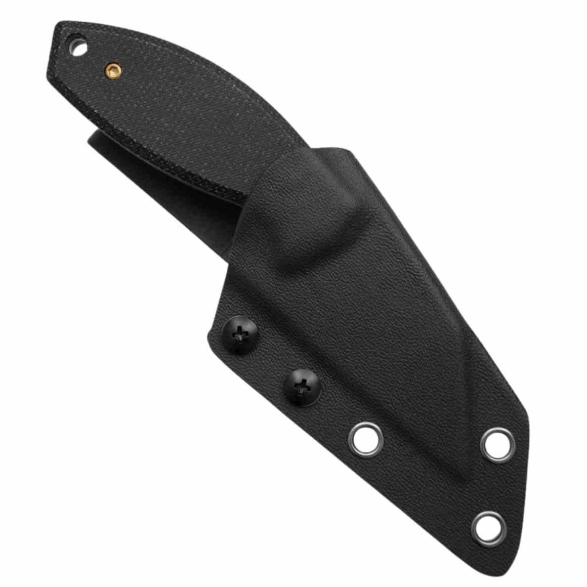 Le manche est composé de plaquettes en Black Micarta (Micarta noir). Ce matériau organique offre une adhérence exceptionnelle qui s'améliore à l'usage, même dans des conditions humides. Malgré sa compacité, l'ergonomie signée Pinkerton permet un contrôle total de l'outil pour une coupe sécurisée. Il est livré avec une housse Kydex technique, fine et facile à dissimuler pour un port quotidien en toute discrétion.