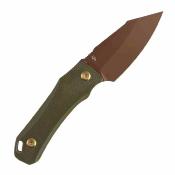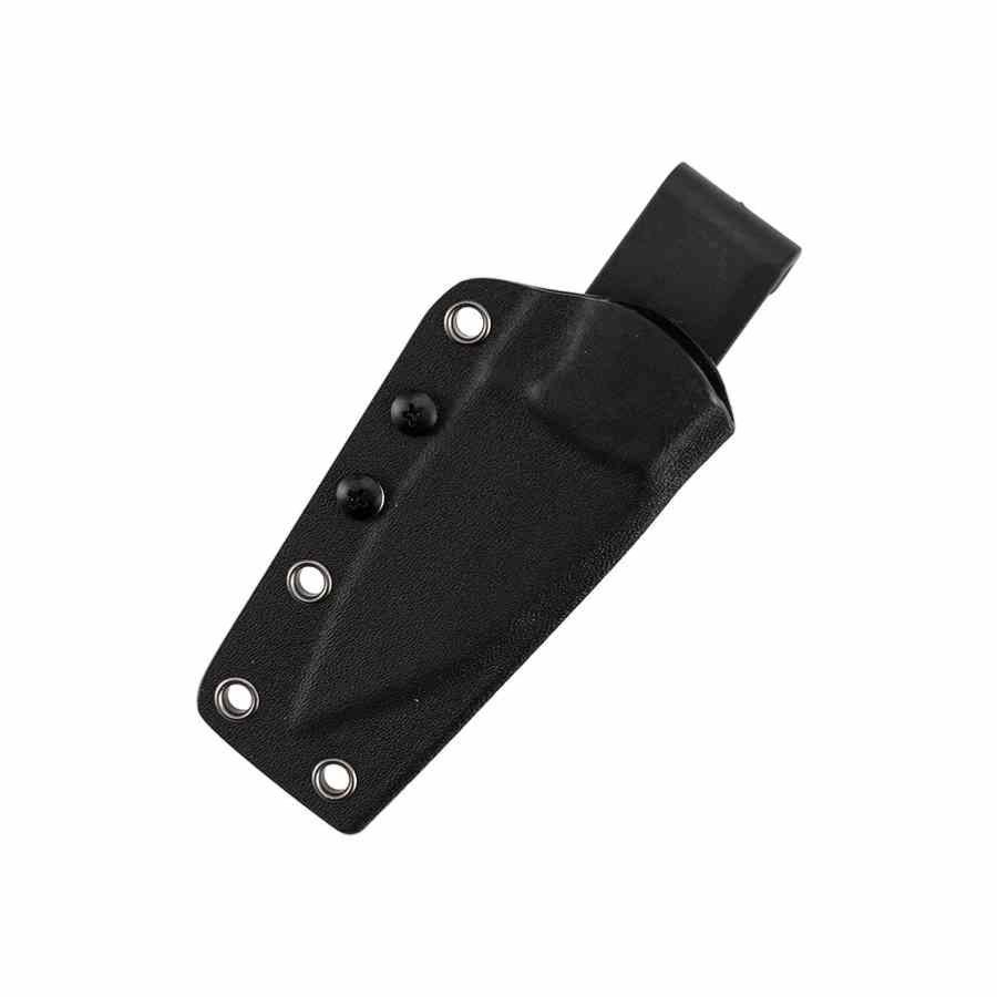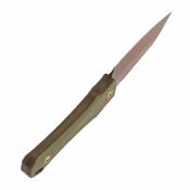 Le manche est composé de plaquettes en Olive Green G10 (Vert Olive), un matériau composite extrêmement résistant aux chocs, à la chaleur et aux variations de température. L'ergonomie du manche, associée au tranchant droit de la lame Wharncliffe, permet une application de force constante jusqu'à la pointe pour un contrôle total. Il dispose d'un passage pour lanière (lanyard hole) et est accompagné d'une housse Kydex technique.