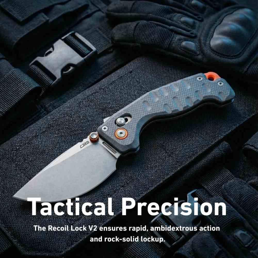 Le manche est équipé de plaquettes en G10 bleu, offrant une texture antidérapante et une ergonomie pensée pour une prise en main ferme, même avec des gants. Le point fort de ce modèle est son mécanisme Recoil Lock V2, un système de verrouillage sur le dos du manche qui permet une manipulation 100% ambidextre et sécurisée, gardant vos doigts hors de la trajectoire de la lame lors de la fermeture.