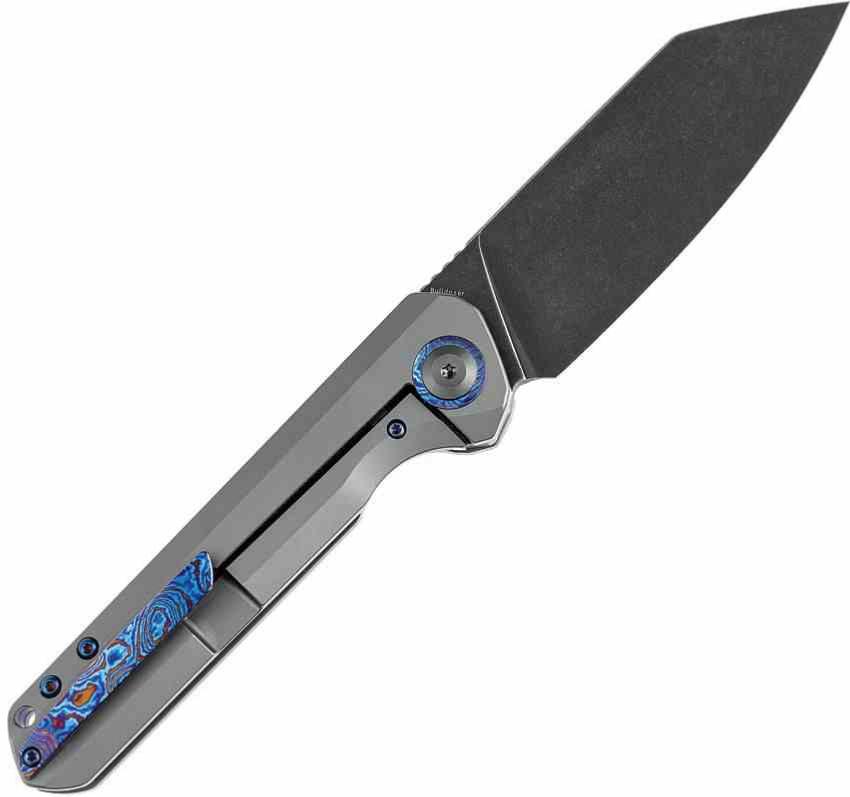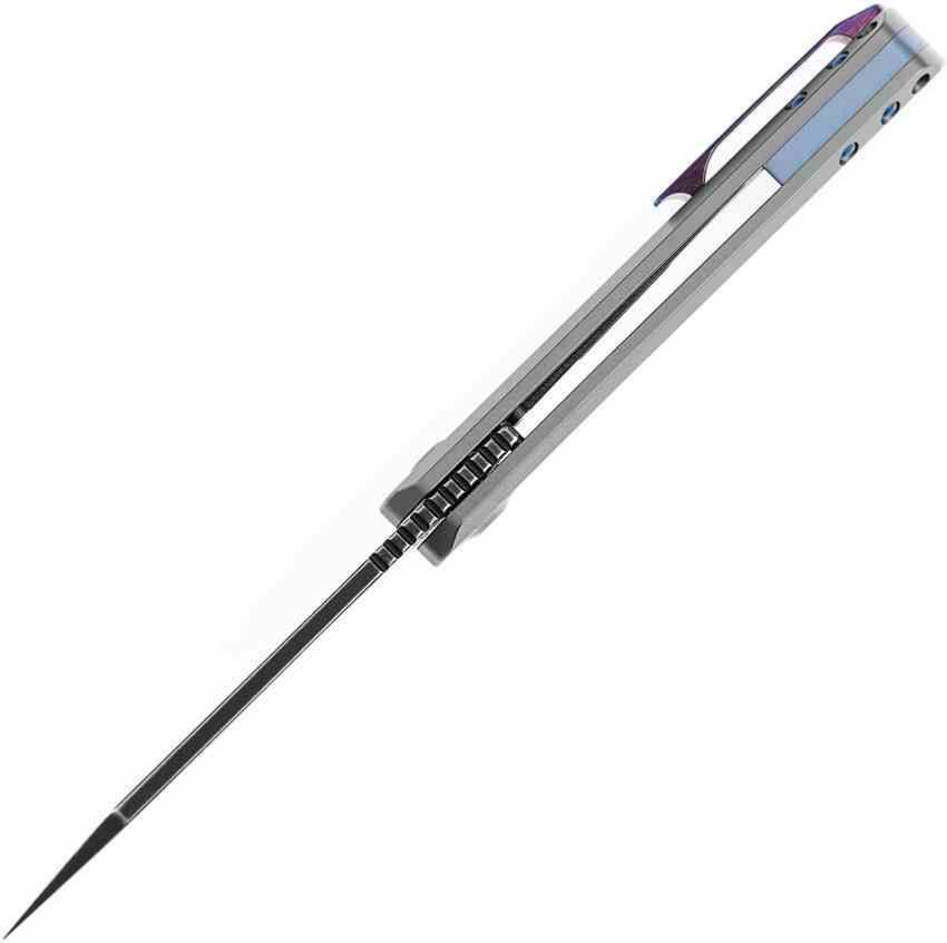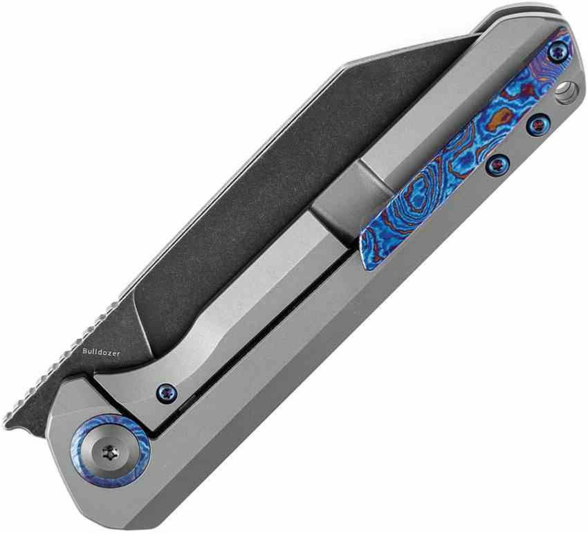 Le manche est entièrement usiné en Titanium 6AL4V avec une finition Gray Anodized (anodisé gris), offrant une solidité structurelle à toute épreuve. Cette version de luxe se distingue par son clip de poche en Timascus (titane damas) aux reflets bleutés, apportant une touche d'exclusivité unique. La sécurité est assurée par un mécanisme Frame Lock avec un insert en acier trempé pour garantir une longévité maximale du verrouillage.