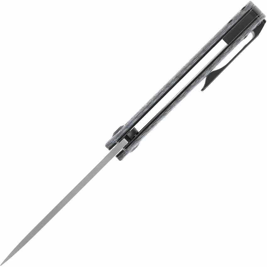La lame tanto en acier damas (longueur 7,8 cm / 3,06") bénéficie d’une géométrie robuste et d’une esthétique raffinée. Le manche en carbone bleu/blanc apporte légèreté et style unique, renforcé par un clip discret.