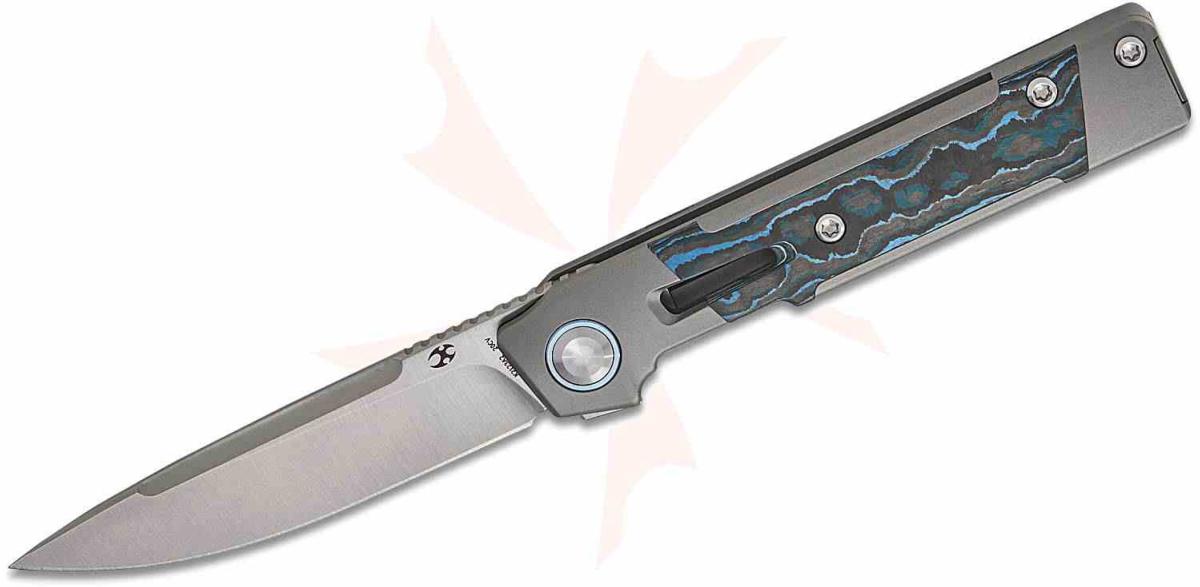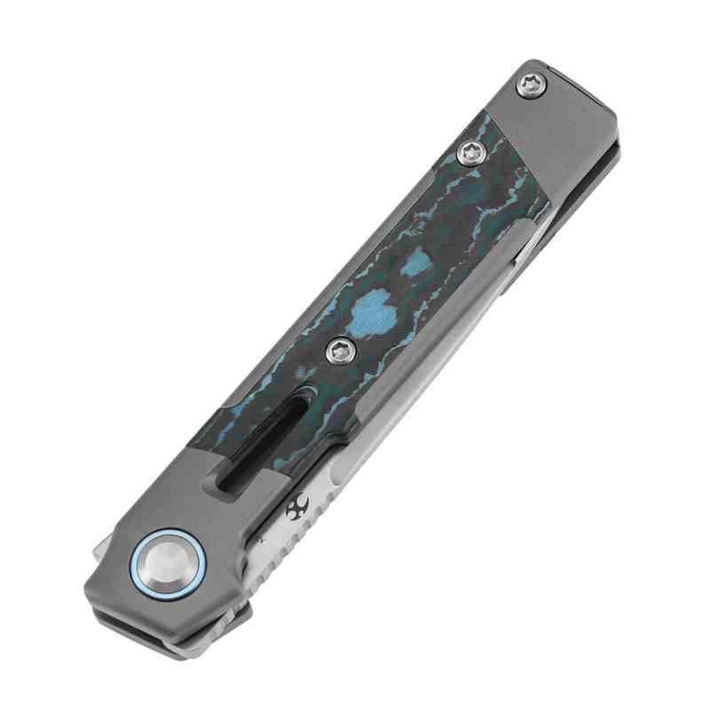 Le Kansept Kitpu K2123A2 est un couteau pliant haut de gamme conçu par Jonathan Styles, alliant matériaux premium, design audacieux et ergonomie soignée. Cette version associe un châssis en titane stonewashed à des plaquettes en FatCarbon Arctic Storm, un composite de fibre de carbone hautement texturé aux reflets bleutés.