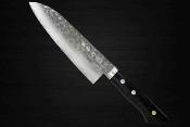 Descriptif : Le couteau de cuisine Kanetsune est doté d'une lame de type santoku en acier VG1/SUS-410 59-60HRC avec une finition martelée. De conception plate semelle le Kengata possède un manche en bois laminé avec des mitres en acier. Le couteau est fabriqué au Japon.