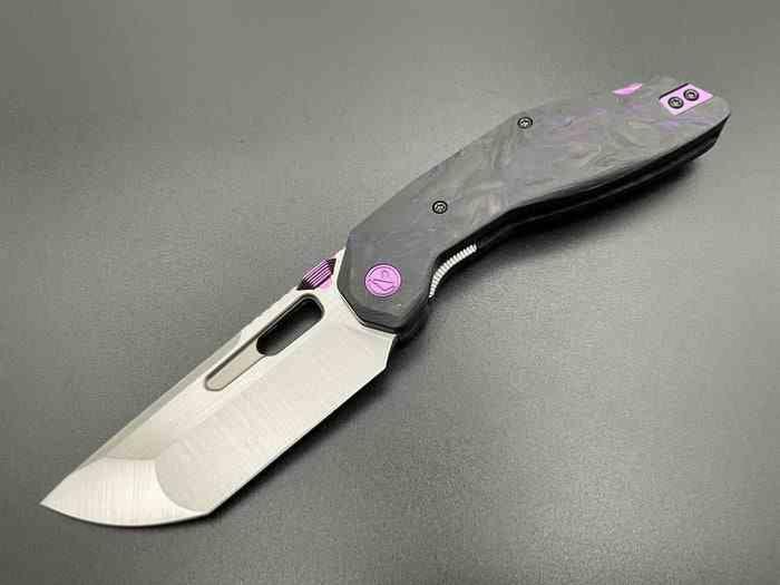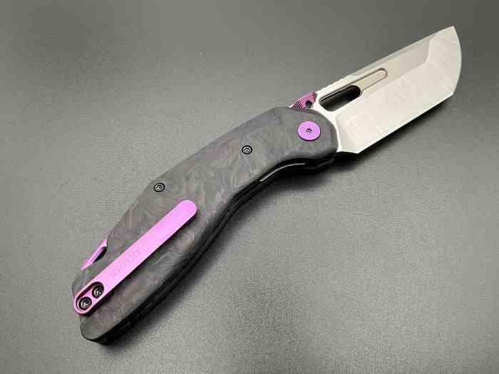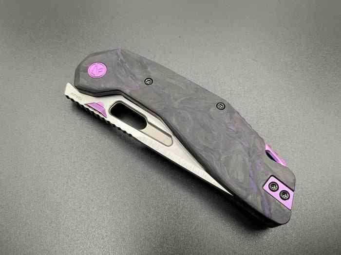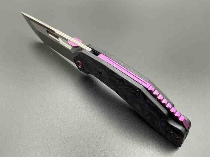 Le manche est composé de plaquettes en Purple Marble Carbon Fiber, où des fibres violettes s'entremêlent de façon organique dans le carbone noir. Le souci du détail est poussé jusqu'à l'anodisation violette des pièces de quincaillerie : la vis de pivot stylisée avec le logo Ketuo, le Thumb Stud cranté et le clip de poche sont tous parfaitement assortis. Ce clip, usiné en Titane 6AL-4V, assure un port discret et une résistance extrême.