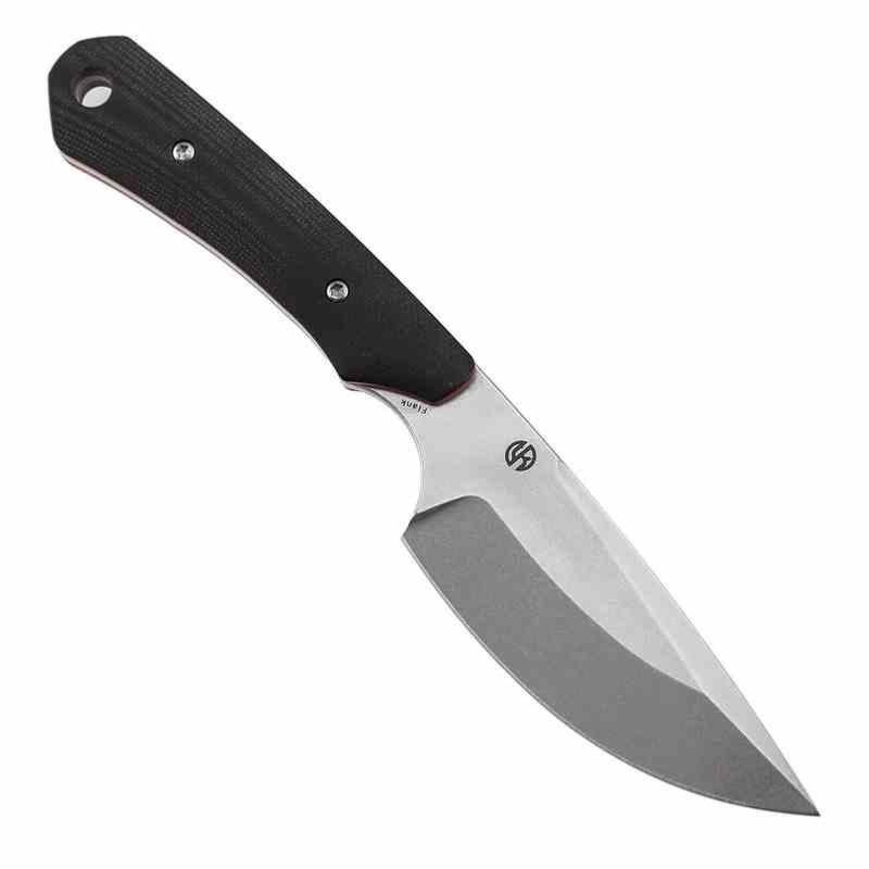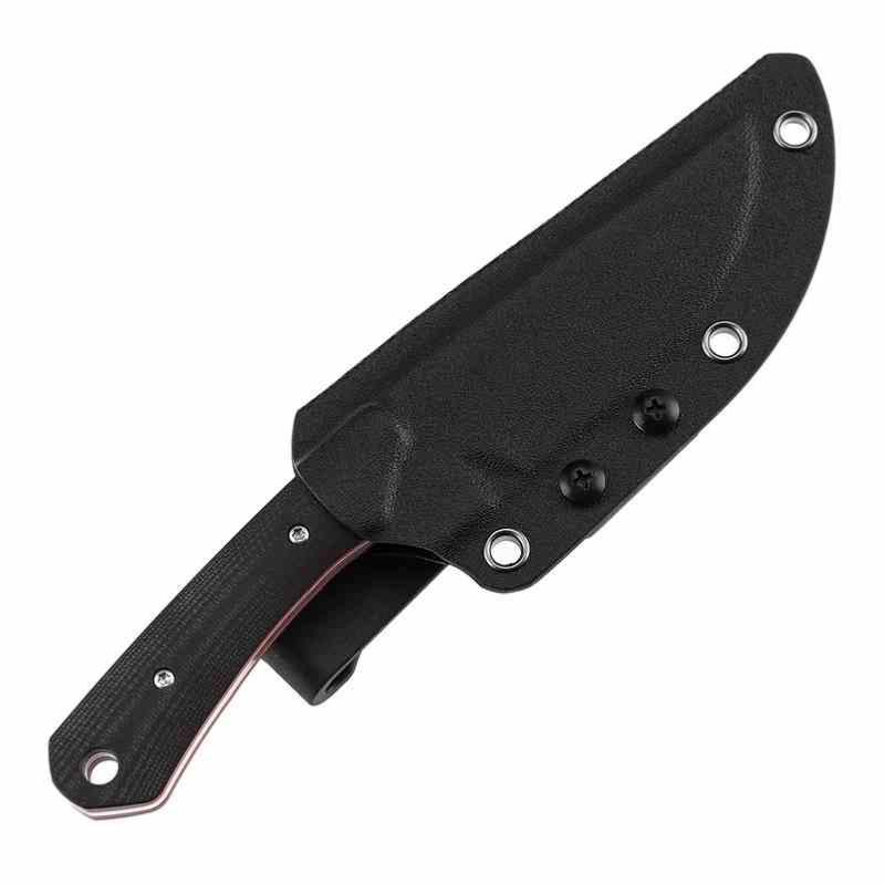 Le manche est en G10 noir avec inserts rouges, usiné en 3D pour une prise en main ferme et confortable. Le profil du manche épouse naturellement la paume, avec une garde intégrée et un talon percé pour l’ajout d’une dragonne. Le couteau est livré avec un étui Kydex noir, compatible avec les fixations Tek-Lok ou autres systèmes de port.