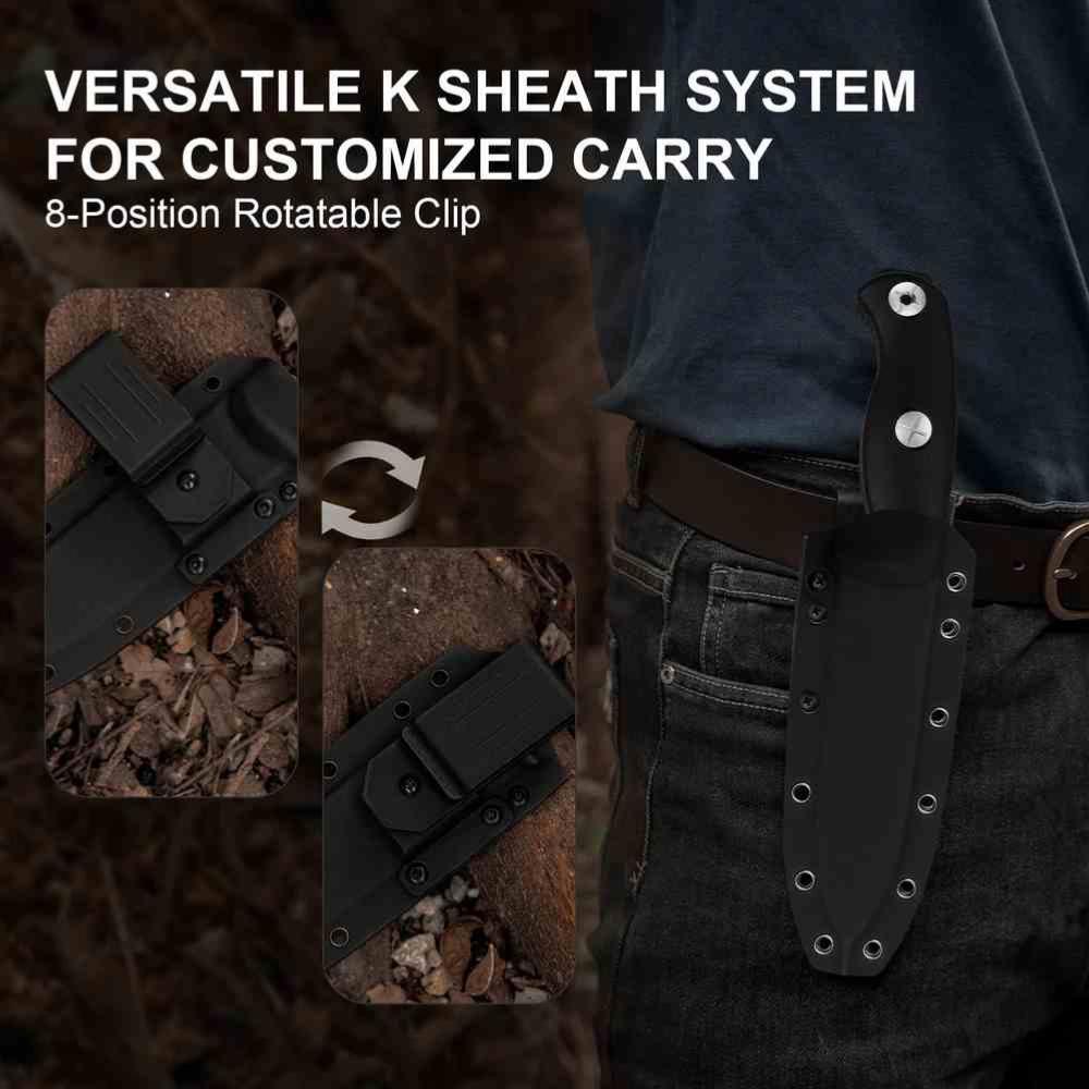 Le manche est équipé de plaquettes en Black G10, offrant un grip texturé et une durabilité totale face aux éléments. L'ergonomie est travaillée avec des zones de jimping sur le dos de la lame pour un contrôle parfait lors des coupes de précision. Ce couteau est un modèle de type étui kydex et est livré avec son étui rigide doté d'un clip rotatif ajustable.