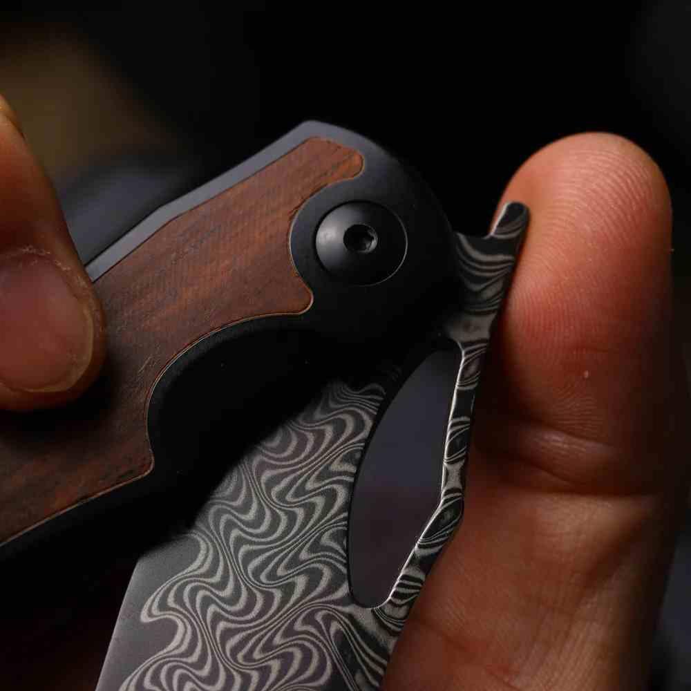 La lame au profil Drop Point est forgée en Lame Acier Damas, offrant un motif visuel unique et une excellente capacité de coupe. Avec une dureté de 58-60 HRC, elle assure une tenue du tranchant exemplaire. L'ouverture est d'une fluidité remarquable grâce aux roulements à billes, activables via un front flipper discret pour une silhouette épurée, ou via le Thumb Stud ambidextre.