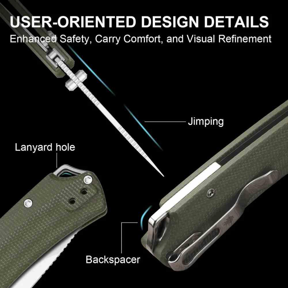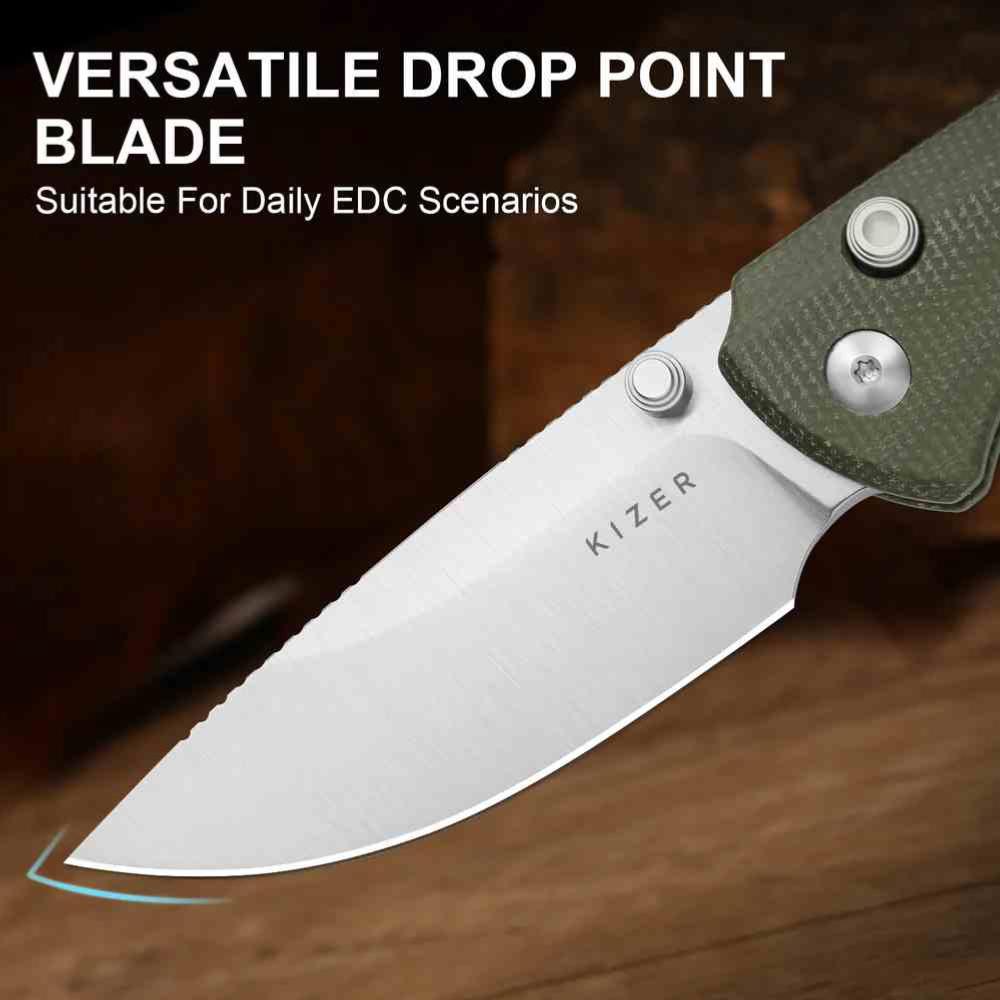 Sa lame Drop Point de 8,1 cm en acier Nitro-V présente une finition satinée, élégante et résistante, garantissant une excellente rétention de tranchant et une dureté de 59–61 HRC. Le manche en Micarta olive apporte robustesse, confort et une esthétique naturelle. Le clip deep carry réversible permet un port discret et adaptable.