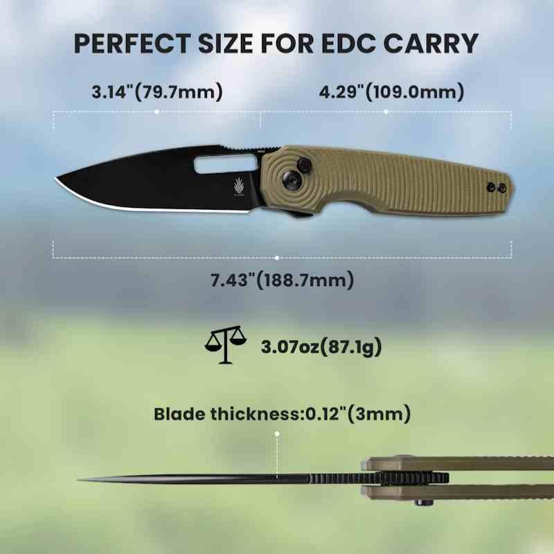Le manche est en G10 vert olive, avec un design ondulé inspiré de l’eau, assurant une bonne adhérence et une esthétique originale. Le système de verrouillage button lock permet une ouverture et fermeture à une main, rapide et sécurisée. Le couteau s’ouvre via un thumb hole ou par pression sur le bouton, selon la préférence de l’utilisateur.