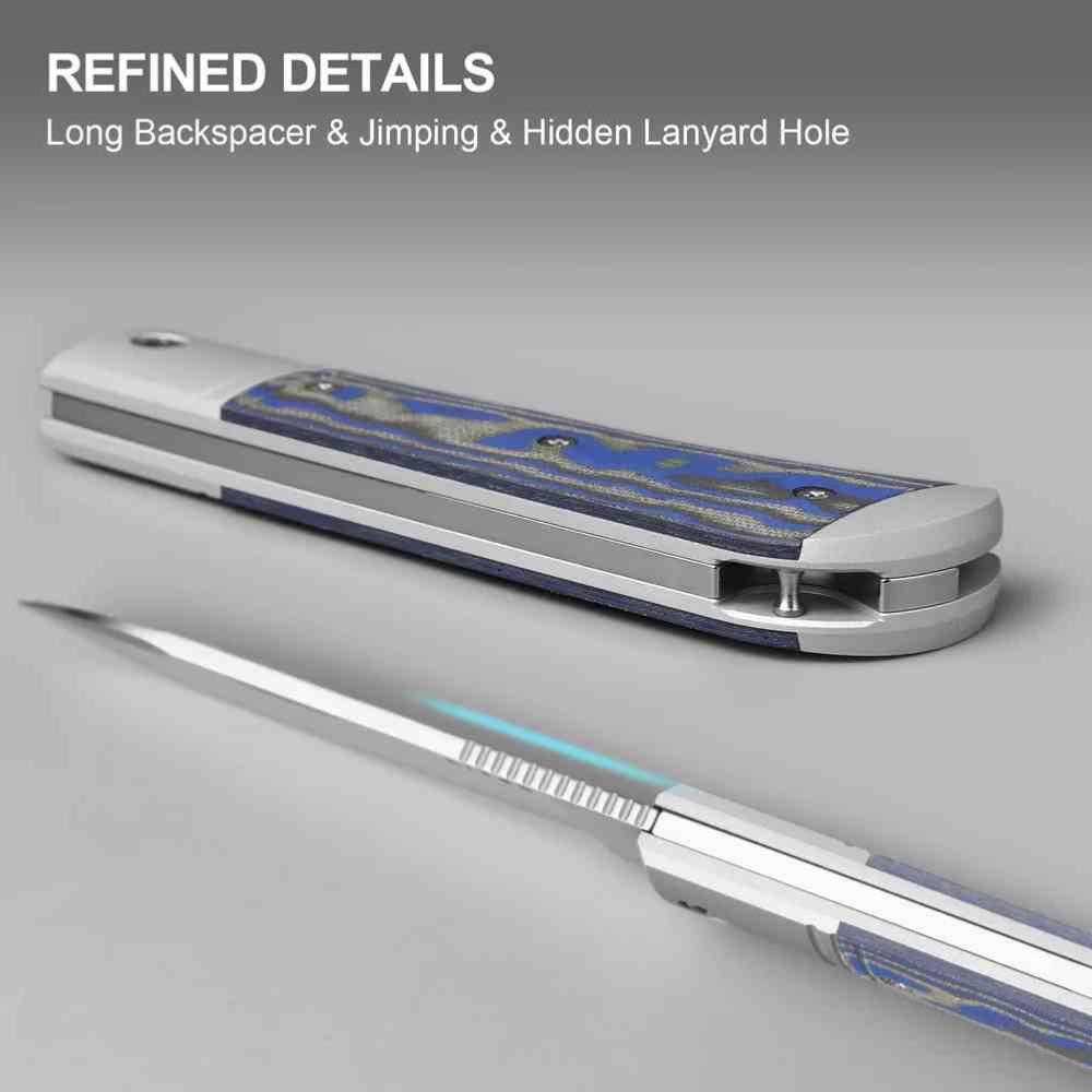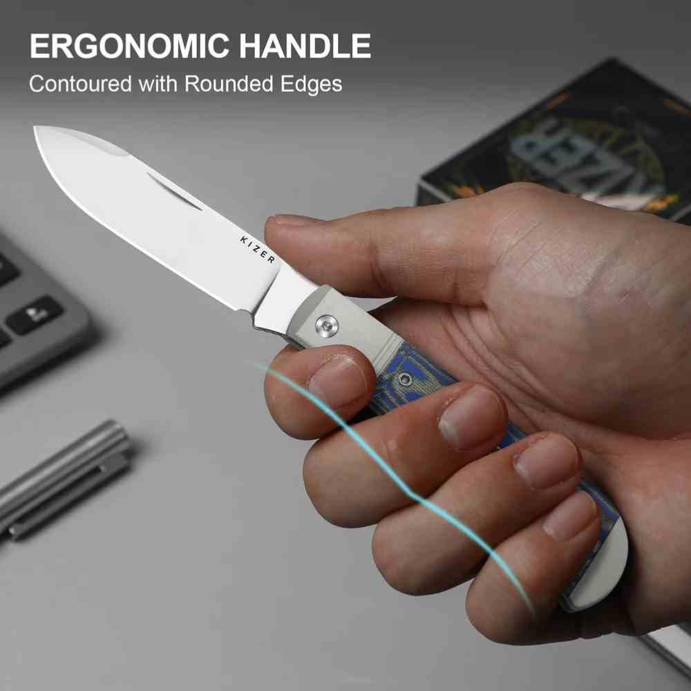Le Kizer Trestle D V3760A2 est un slipjoint moderne concu pour l’EDC, combinant legerete, precision et materiaux premium. Sa lame drop point en acier Nitro-V offre une excellente tenue de coupe et une resistance accrue a la corrosion. La finition satin met en valeur la geometrie de la lame. Le manche en aluminium Gray integre des inlays en Vortex Micarta Blue, apportant style, ergonomie et adherence. Le couteau s’ouvre via un nail nick. Un slipjoint contemporain, legal dans de nombreux pays, ideal pour un port quotidien discret et efficace.