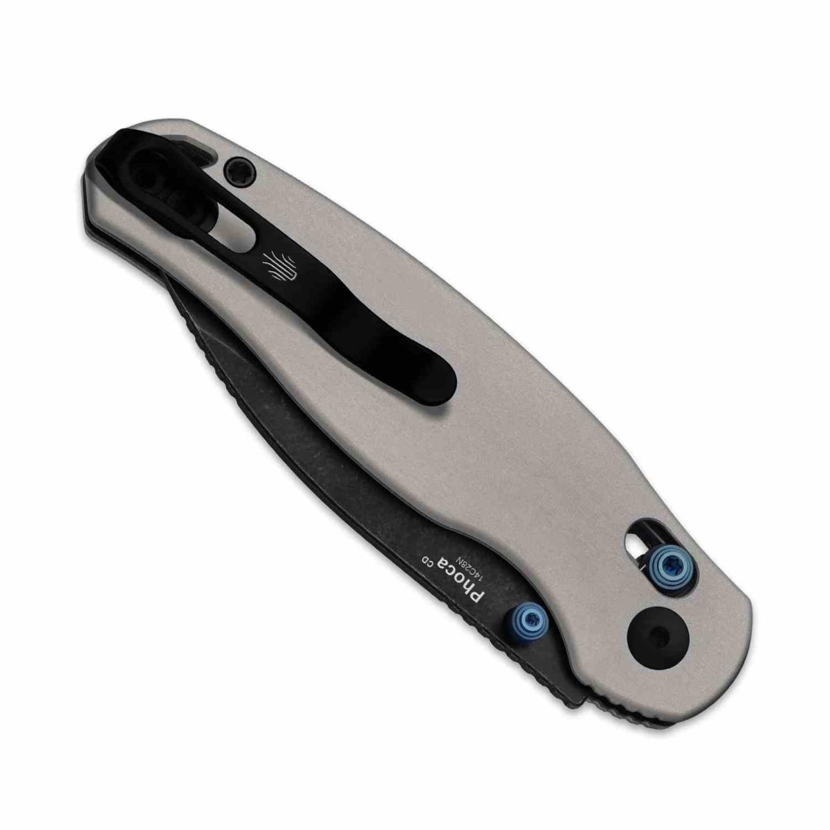 Le manche est fabriqué en Aluminum de couleur Light Gray (Gris Clair), offrant une structure à la fois légère, rigide et inaltérable face aux éléments. L'innovation majeure réside dans son mécanisme de verrouillage Clutch Lock, un système de type crossbar exclusif à Kizer qui permet d'ajuster la tension des ressorts selon vos préférences. Le couteau est complété par un clip de poche "Deep Carry" réversible pour un port totalement discret.