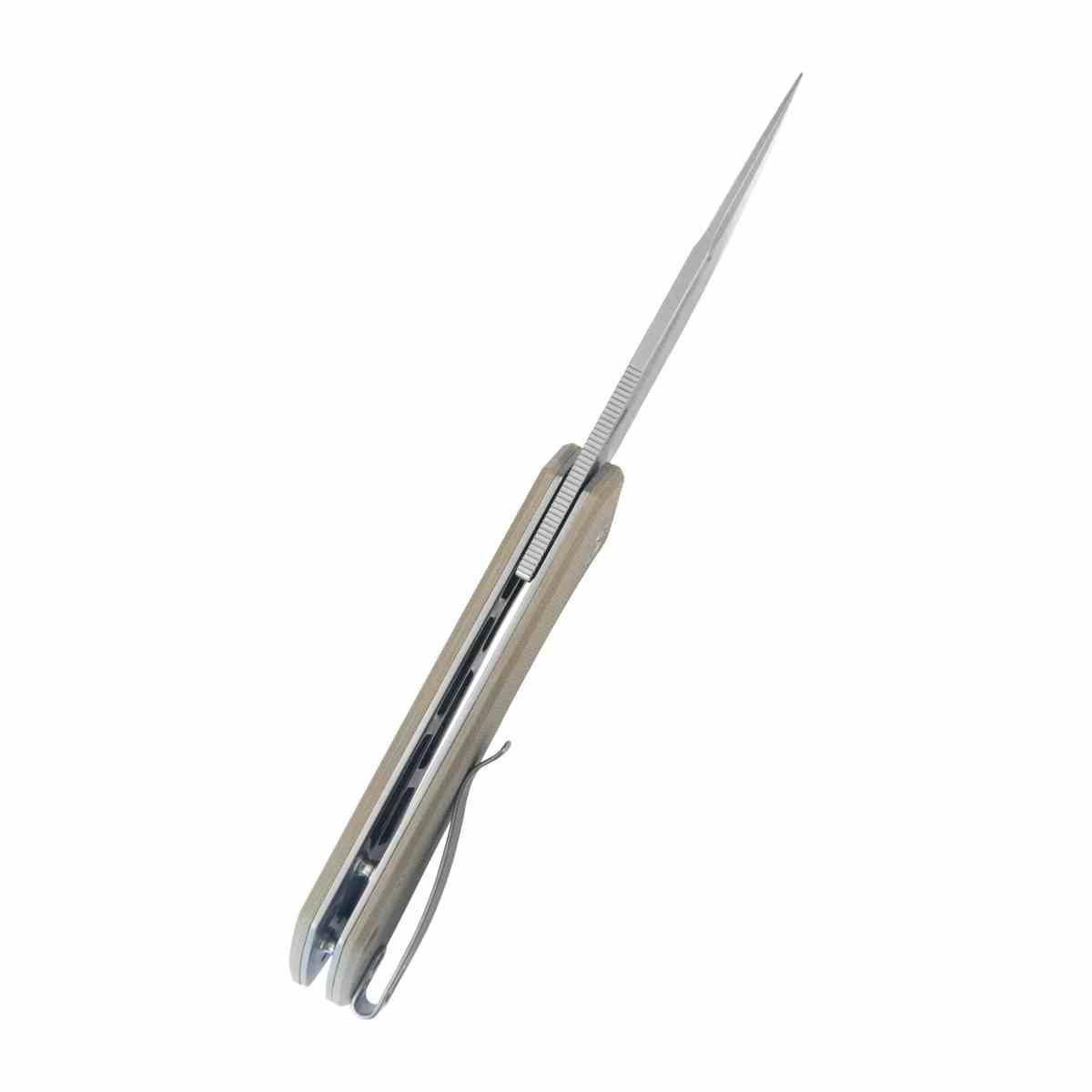 Le manche est composé de plaquettes en Tan G10, un matériau composite inaltérable qui offre une prise en main texturée et sécurisante. La forme du manche est pensée pour épouser la main, réduisant la fatigue lors d'un usage intensif. Le mécanisme de verrouillage Liner Lock assure une sécurité sans faille. Il est équipé d'un clip de poche en acier inoxydable pour un port discret et un accès rapide.