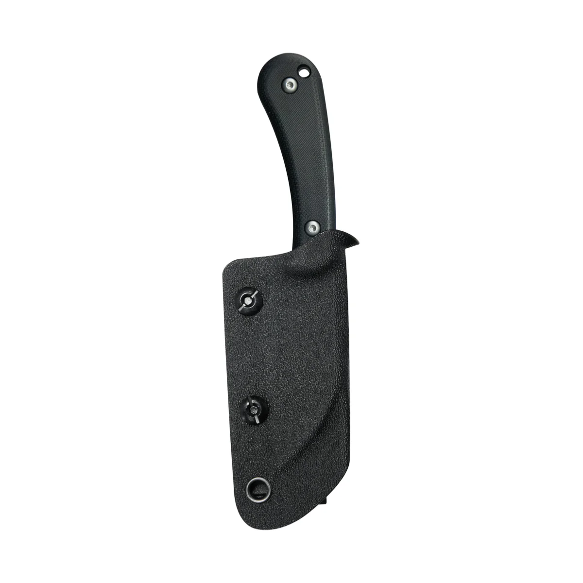Le manche est équipé de plaquettes en Black G10, un matériau composite ultra-résistant qui ne craint ni l'humidité ni les variations de température. Son ergonomie est travaillée avec des rainures de doigts et une texture antidérapante pour une prise en main ferme et sécurisée. Ce couteau est un modèle de type étui kydex et est livré avec sa housse rigide noire équipée d'un clip de port réglable pour une fixation facile à la ceinture ou au sac.