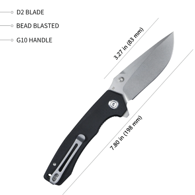 Descriptif : Le couteau Kubey EDC est doté d'une lame drop point en acier D2 59-61HRC avec une finition microbillée. L'ouverture d'une main est très fluide grâce au pivot sur roulement à billes. Le manche est en acier & en G10 Black. En position ouvert la lame du couteau est bloquée par un linerlock. Le clip permet un accès rapide au couteau.