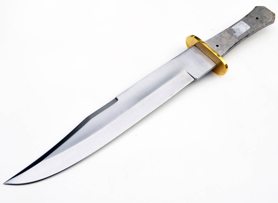 Longueur totale 38.10cm - Longueur de lame 22.22cm - Construction plate semelle - Lame clip point en acier inox - Garde en laiton - Trou dans le manche pour fixer les plaquettes
