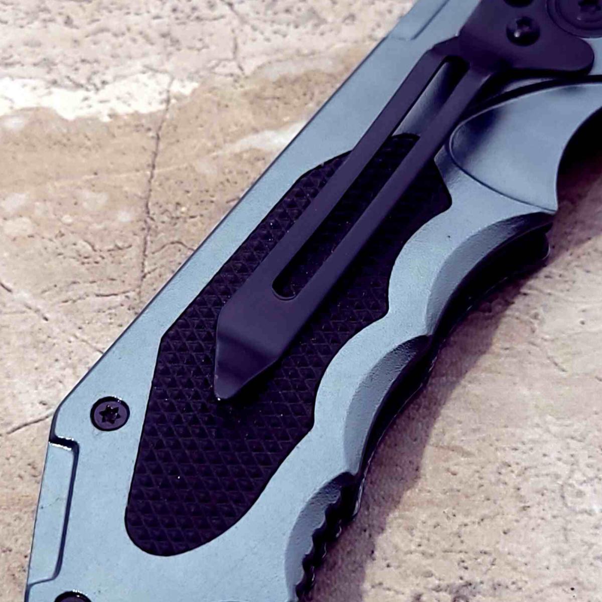 Le manche de 11,43 cm (4.5") est fabriqué en Aluminum gris anodisé, intégrant un insert en caoutchouc noir (Black rubber insert). Cette combinaison de matériaux garantit une légèreté structurelle alliée à un grip antidérapant exceptionnel, même avec des mains humides ou gantées. Le design ergonomique est complété par un Pocket clip (clip de poche) robuste, permettant un port quotidien discret et un accès immédiat.